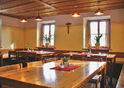 Der Saal mit Bestuhlung ist das Herzstück im Gruppenalltag. Im Seitentrakt sind 3 Mehrbettzimmer und ein Einzelzimmer mit Dusche und Toilette untergebracht.